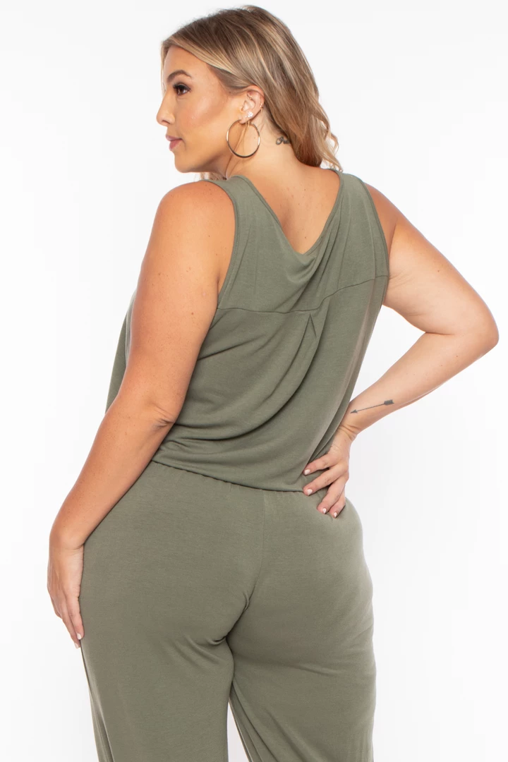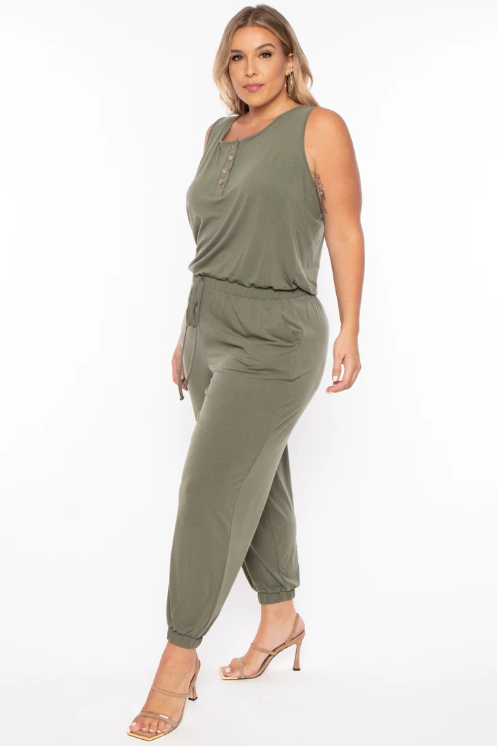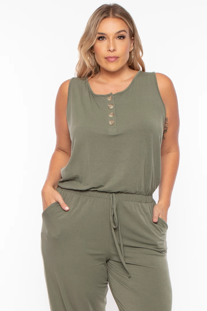 This plus size, stretch knit lightweight lounge jumpsuit features a round neckline 4 front button-up closure sleeveless cut with elastic hem, an elastic waistband for added comfort, and self-tie detail side pockets, a relaxed fit, and a skinny leg with elastic hem.