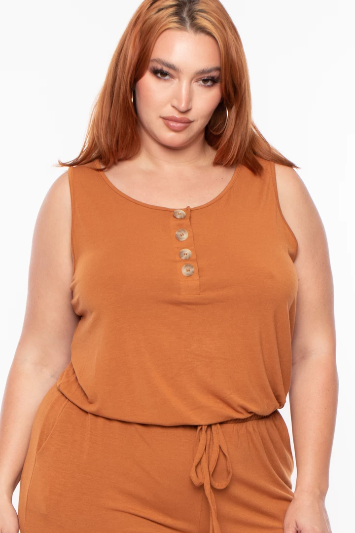 This plus size, stretch knit lightweight lounge jumpsuit features a round neckline 4 front button-up closure sleeveless cut with elastic hem, an elastic waistband for added comfort, and self-tie detail side pockets, a relaxed fit, and a skinny leg with elastic hem.