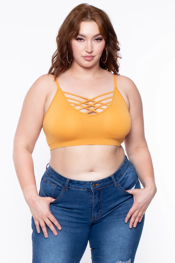 This plus size, stretch knit bralette features a scoop neckline with a X-front caged cutout design, adjustable cami straps, and molded cups for support.